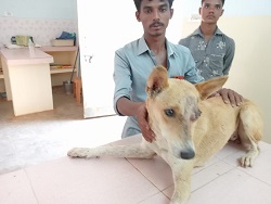 Two brothers brought their Indian street dog to our clinic. The poor dog had a severe eye injury. They said that the dog had gone into the neighbors house and he was badly beaten up. He was taken in as an inpatient by Karuna and the veterinary surgeon removed the damaged eye. He is