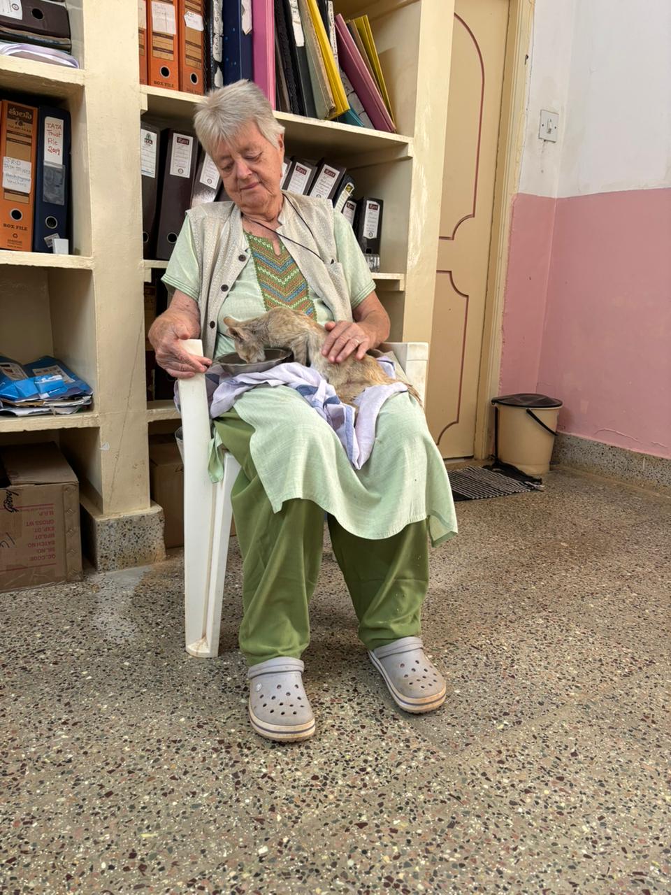 Recently Smita the kitty came to us, starving and paralysed, suffering and pleading for our help! Now she feels comforted and hopeful with our care! Here is Karuna’s President Clementien, nearly 80 years old and still dedicating her life to the animals in the Puttaparthi area for the last 25+ years. THANK YOU for joining with us to save the animals!