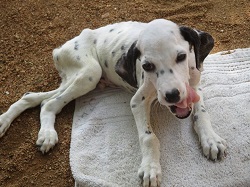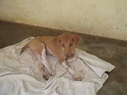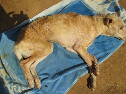 This dog is paralyzed, caused by distemper. The owner has tried to treat it on its own by “burning”: when a hot knife is used to make crosses and lines burned into the skin. The idea behind it is that by causing one problem, two problems might be solved. When I worked with horses 50