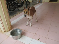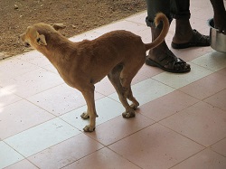 This is Bobo, a large Indian dog that was paralysed after an accident. He recovered but his hind legs move a bit out of control. He is always in a good mood!